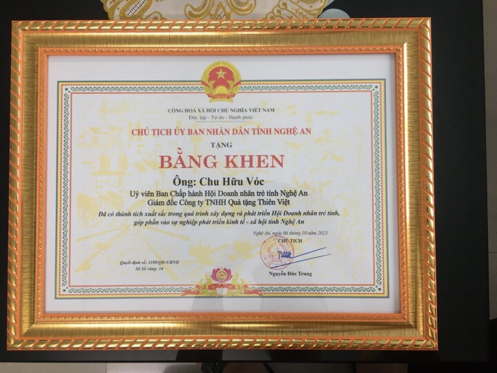 “Tôi rất tự hào và biết ơn khi nhìn thấy những nỗ lực và đam mê của mình được công nhận và đánh giá cao. Đây sẽ là động lực lớn để tôi tiếp tục cống hiến và đồng hành trong sự phát triển của doanh nghiệp và đất nước. Tôi tin rằng sự đóng góp của chúng tôi sẽ góp phần xây dựng một tương lai tươi sáng và thịnh vượng cho cả doanh nghiệp và cộng đồng”, giám đốc công ty Quà tặng Thiên Việt – Chu Hữu Vóc chia sẻ.
